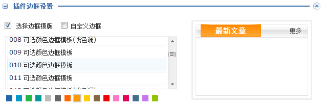 插件边框是插件外面的修饰框,包括标题栏和边框线,也有部分边框模版没有边框线以适应特殊需要。插件边框有选择模版和自定义边框两种形式: 1、自定义边框