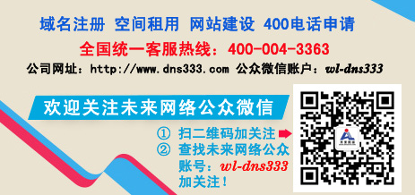 未来网络公众平台分享互联网络热点资讯、网络创业知识、网站推广介绍、网站维护常识等互联网络应用常识!即日起关注未来网络公众微信(wl-dns333)享受域名注册37元、200M港台空间100元 特价优惠!详情QQ咨询!